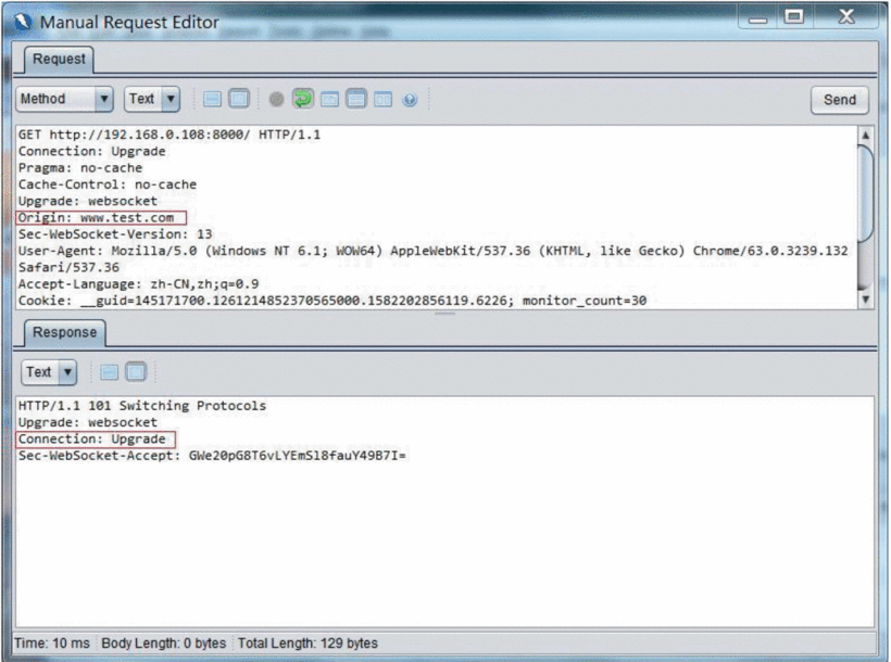 图6显示了没有采取任何防御措施的实验结果。原点字段被修改,但连接仍然成功建立,说明存在跨站点WebSocket劫持漏洞。