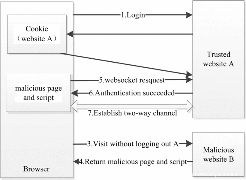 首先,用户登录并浏览受信任的网站A,登录成功后,浏览器将用户认证信息保存在Cookie中。此后,用户的每次HTTP请求都会自动带上cookie来验证客户端用户的身份。如果恶意网站B在页面中植入与网站A建立WebSocket连接的握手请求,当用户在没有退出网站A的情况下访问恶意网站时,A网站的Cookie会自动添加到请求头中,而服务器并不知道。所以恶意网站可以冒充用户的身份,成功与服务器建立连接,然后窃取服务器消息或发送伪造的请求来篡改数据。