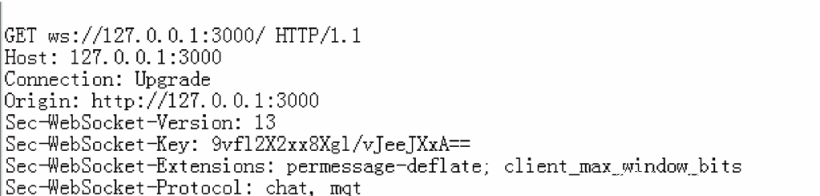WebSocket 连接握手是通过 HTTP 完成的。首先,浏览器客户端调用 WebSocket API 以启动连接请求。虽然请求地址以’ws’开头,但它本质上是一个HTTP请求,只是与普通的HTTP请求不同。图 2 是 WebSocket 连接请求消息的部分报头,其中 sec-websocket-key 字段是由客户端生成的 24 位基于 64 字符的随机序列,用于握手验证。