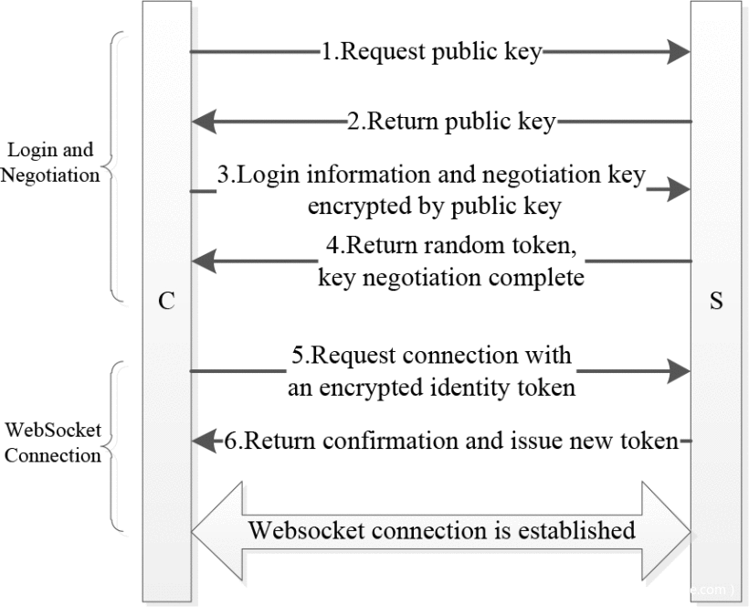 WebSocket连接是在HTTP握手的基础上完成的。本文设计的方案是在此基础上改为六次握手阶段。前四次握手用于登录和协商密钥,后两次握手用于建立WebSocket连接并返回新的令牌。