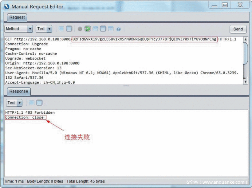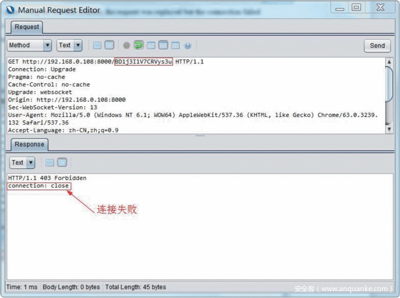 之后,取出捕获的响应数据包中的Token值,替换成请求数据包中的Token。而后再次发送请求,但连接再次失败,如图8所示。这是因为Token没有加密,服务器验证还是失败了。