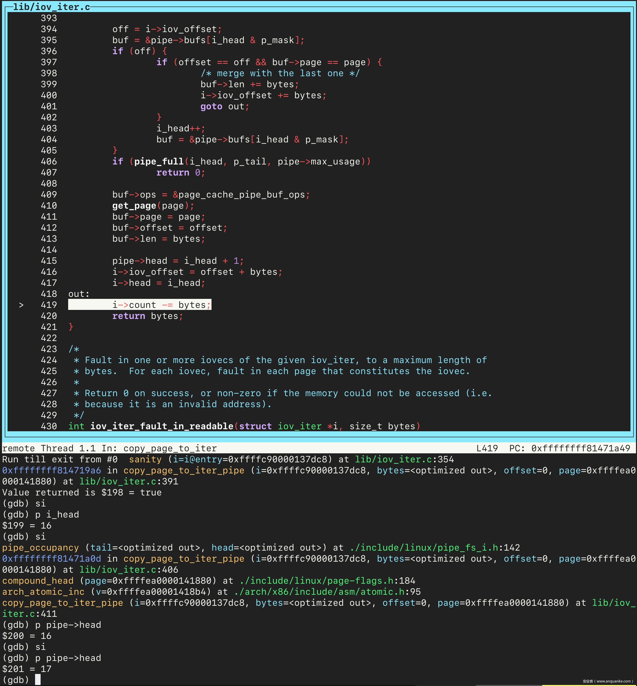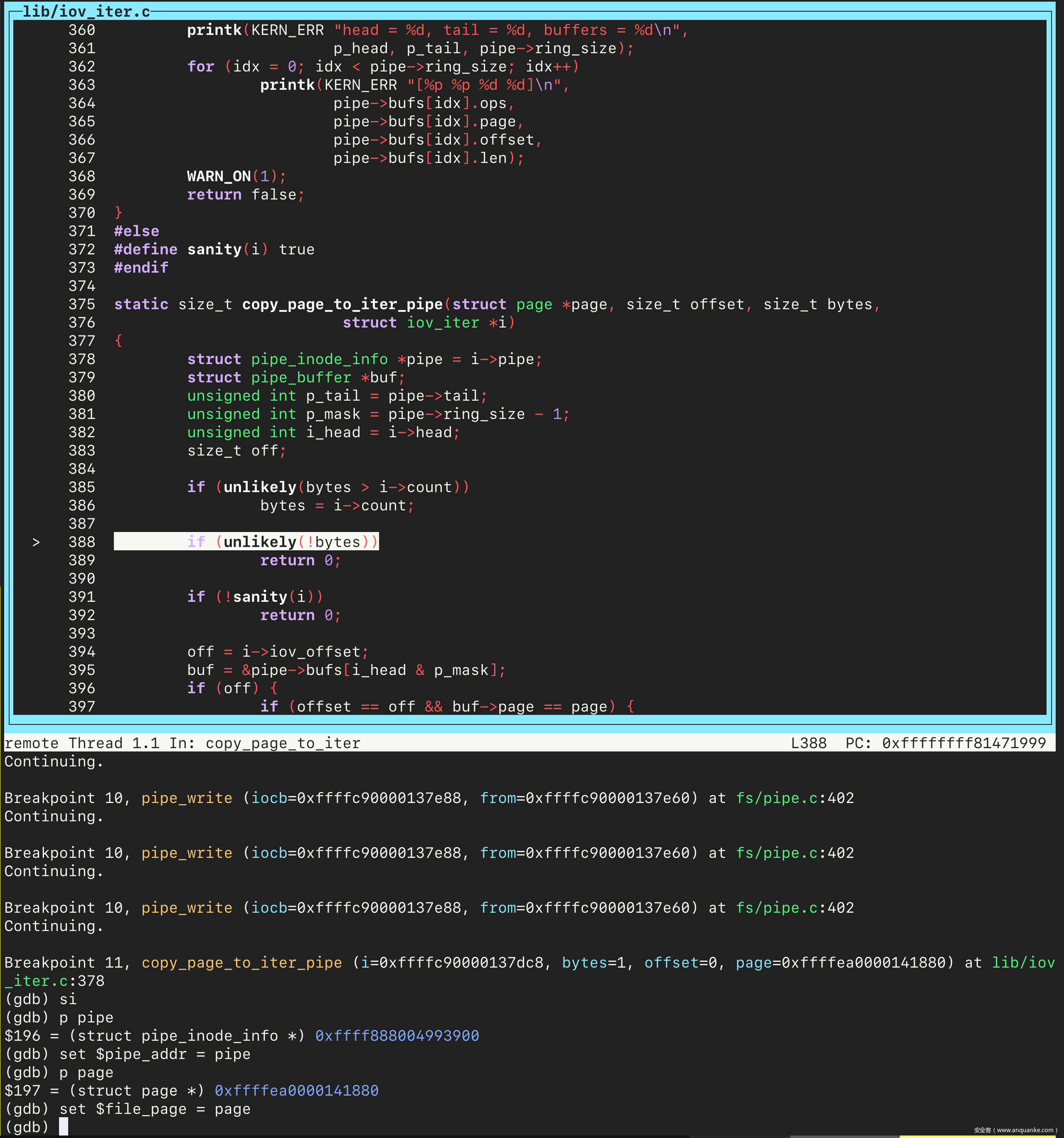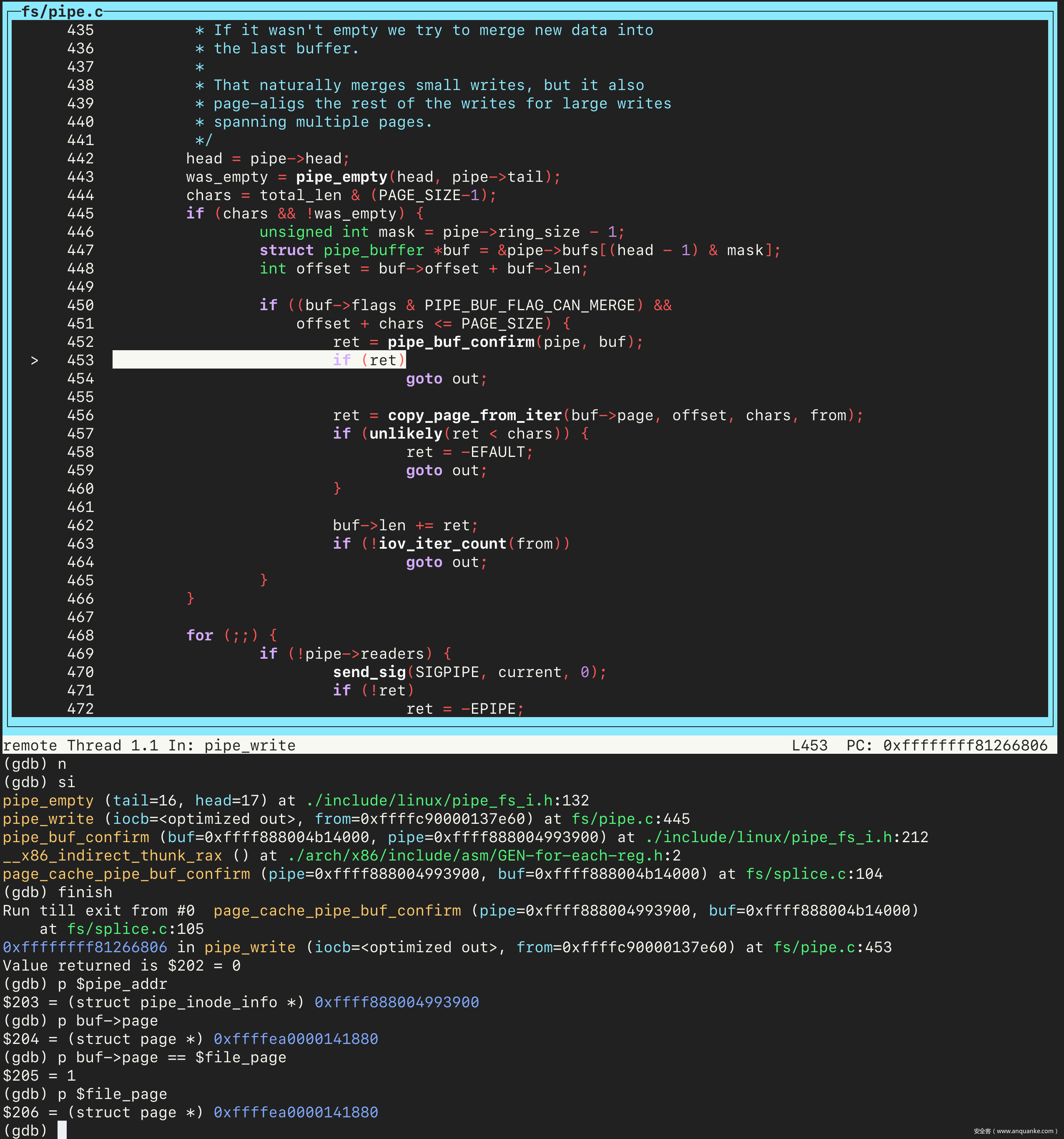 接着执行 continue 命令,会在 copy_page_to_iter_pipe 处停下来。单步进入几步之后,先把 pipe 变量和文件对应的 page 实例的地址保存到变量中。