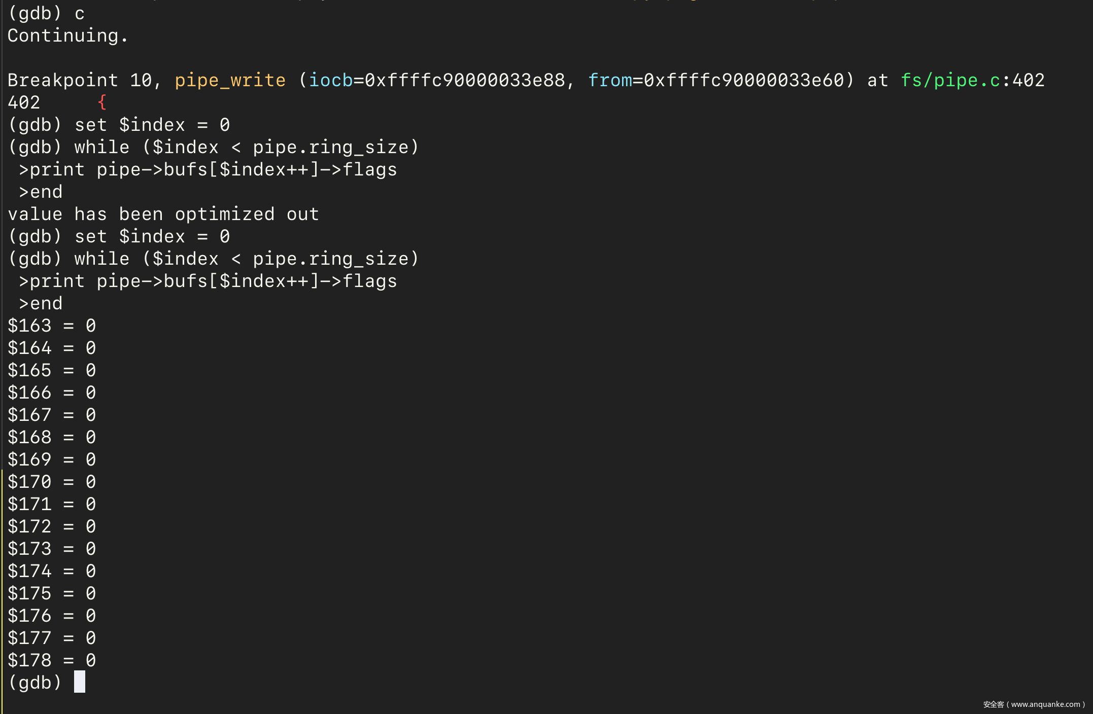 然后在 GDB 中使用 continue 命令让虚拟机继续运行,并执行 PoC 程序。然后会在 pipe_write 处停止。使用下面的 GDB 脚本可以看到,pipe 的所有 pipe_buffer 中的标志位都为零: