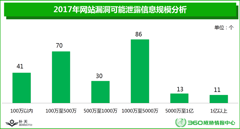统计显示,在251个可导致信息泄露的网站漏洞中,共有24个网站漏洞可能泄露的信息在5000万条以上,其中还有11个漏洞可能泄露的信息数量在1亿条以上。下图给出了2017年网站漏洞可能泄露信息的规模分析。