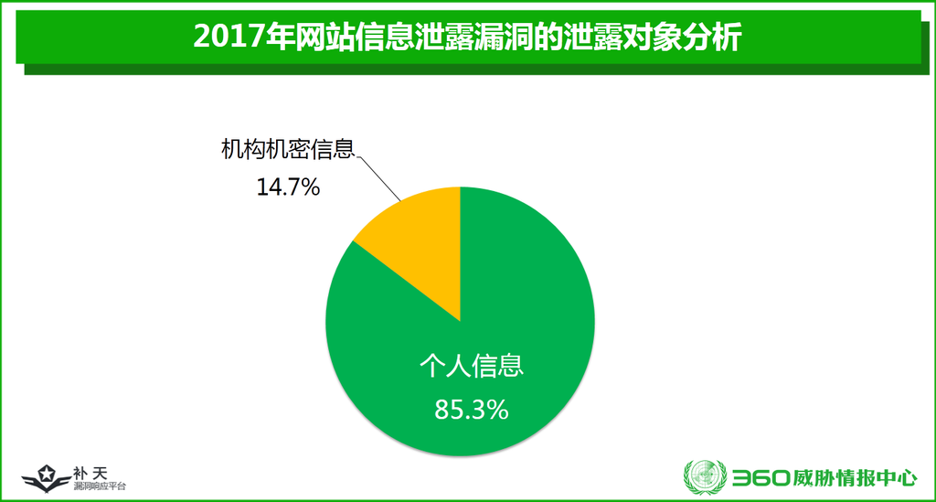 360威胁情报中心的监测显示,补天平台收录的信息泄露相关漏洞中,有85.3%的相关漏洞泄露的属于个人信息,14.7%相关漏洞泄露的属于机构机密信息。