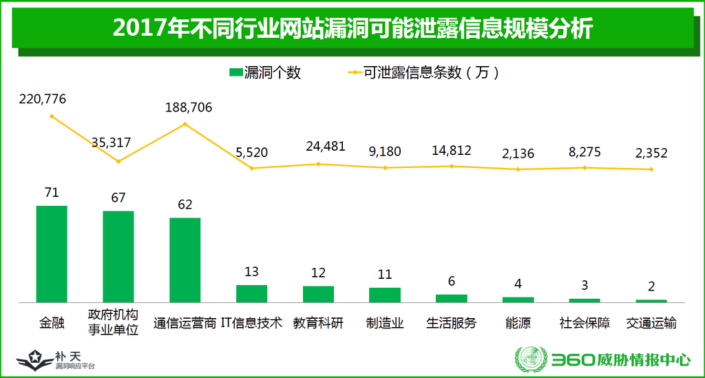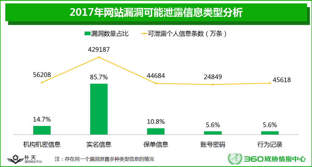 统计显示,251个可导致信息泄露的网站漏洞,总计可能泄露信息为51.1亿条,比2016年的60.5亿条下降了15.5%;比2015年的55.3亿条下降了7.6%。平均每个漏洞可导致2035.9万条个人信息泄露,单个漏洞的危害大大增加。