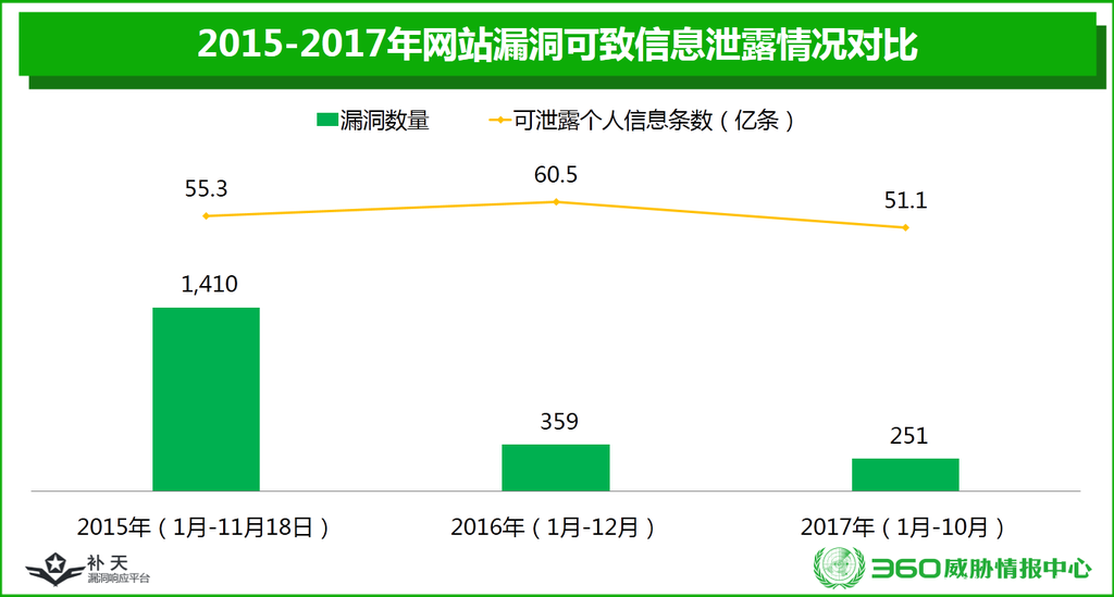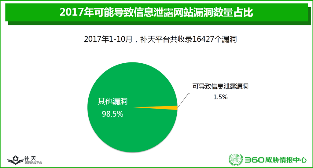 2017年1月至10月,补天平台共收录可导致信息泄露的网站漏洞251个,较2016年的359个下降了30.1%,约占补天平台全年漏洞收录总数(16427个)的1.5%,涉及网站150个,共可能泄露信息51.2亿条。