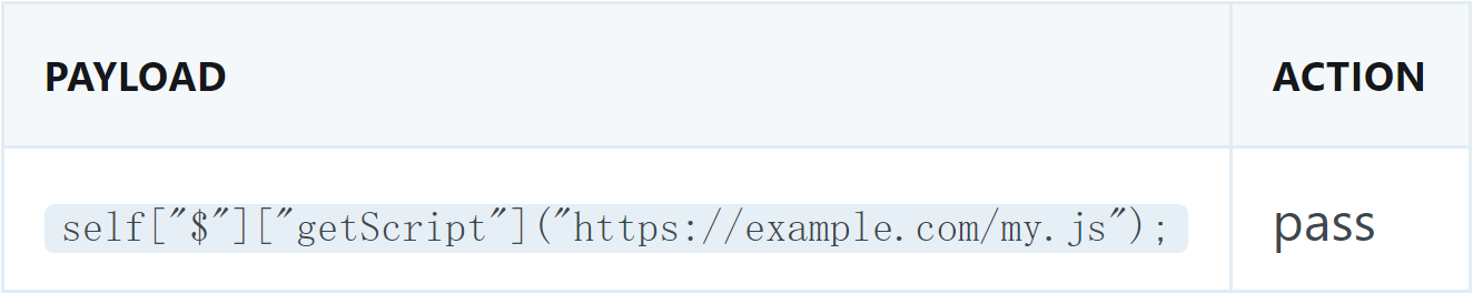 没错,JavaScript可以帮助我们以多种方法来绕过过滤器,而之前所提到的这些技术会更加适用于使用了jQuery之类的第三方库的现代网站。首先,我们假设无法使用“self[“eval”]”以及其对应的十六进制序列,那么我们就可以让jQuery来帮助我们了,比如说,使用“self[“$”][“globalEval”]”: