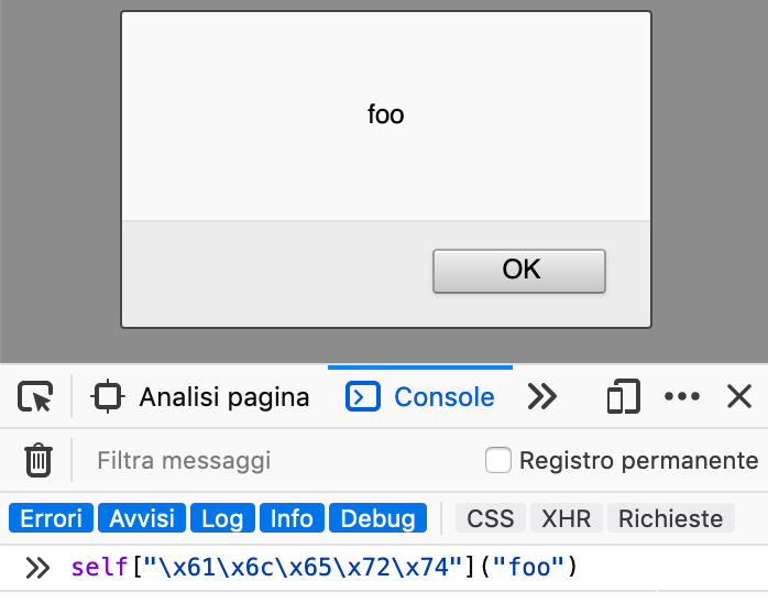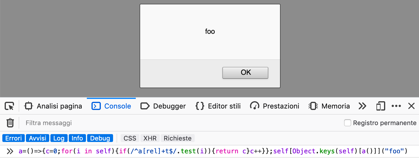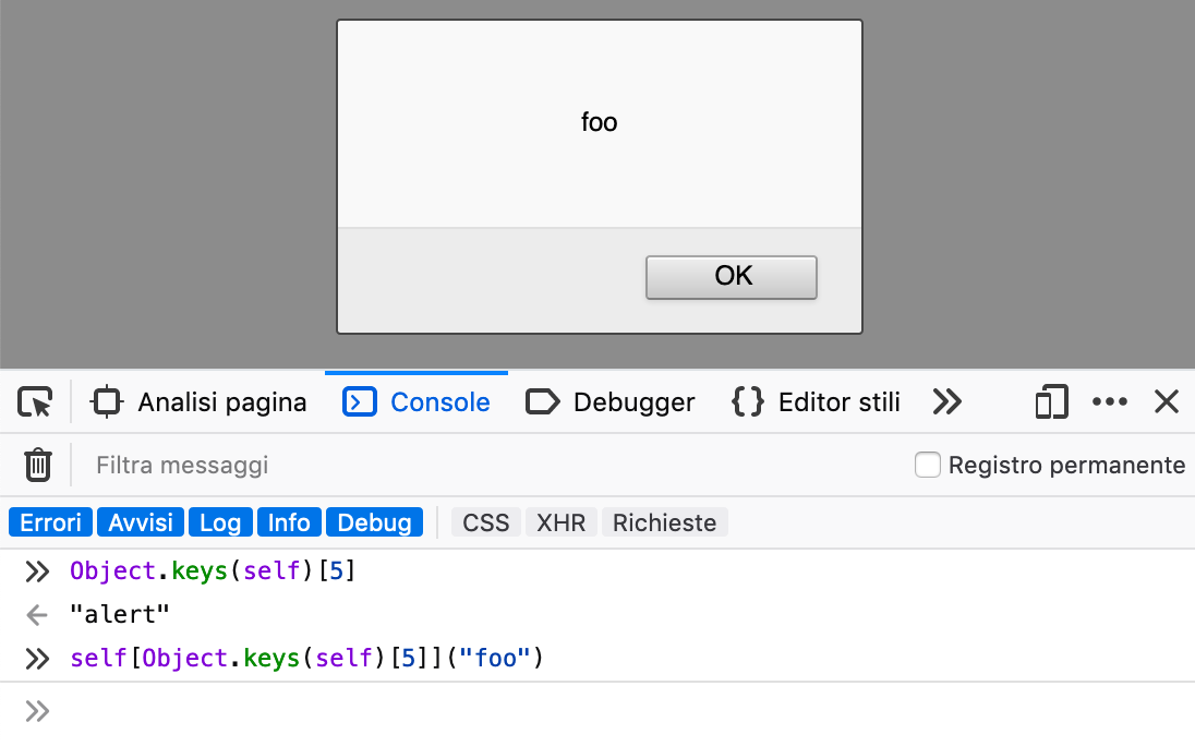 > self[Object.keys(self)[5]]("foo") // alert("foo")