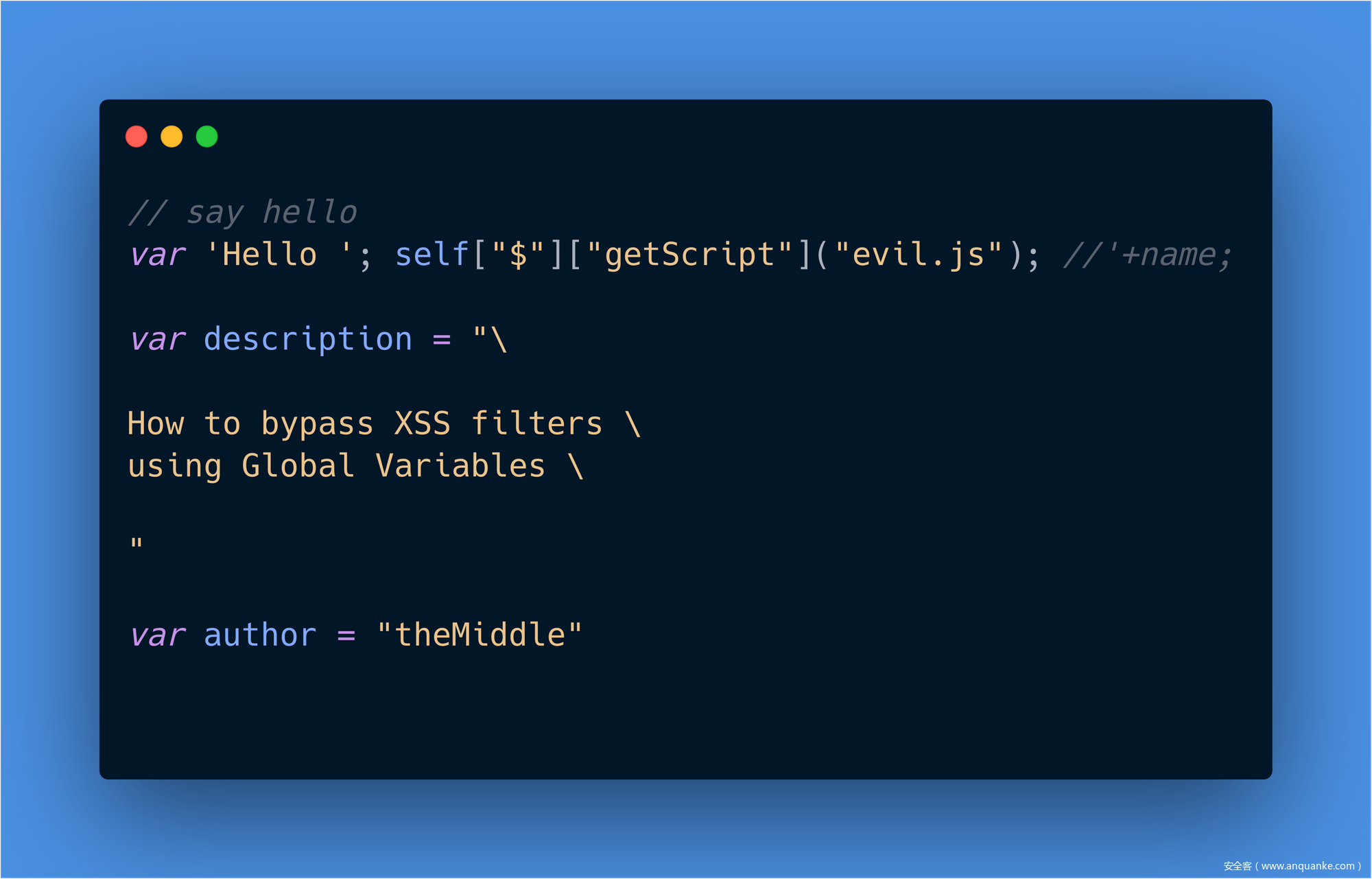接下来,我们将讨论利用反射型或存储型XSS漏洞的各种可能性,并绕过我们与目标站点之间的XSS过滤器或防火墙。而在我们看来,其中一种最为有效的绕过方法就是利用类似self、document、this、top或window这样的全局变量。