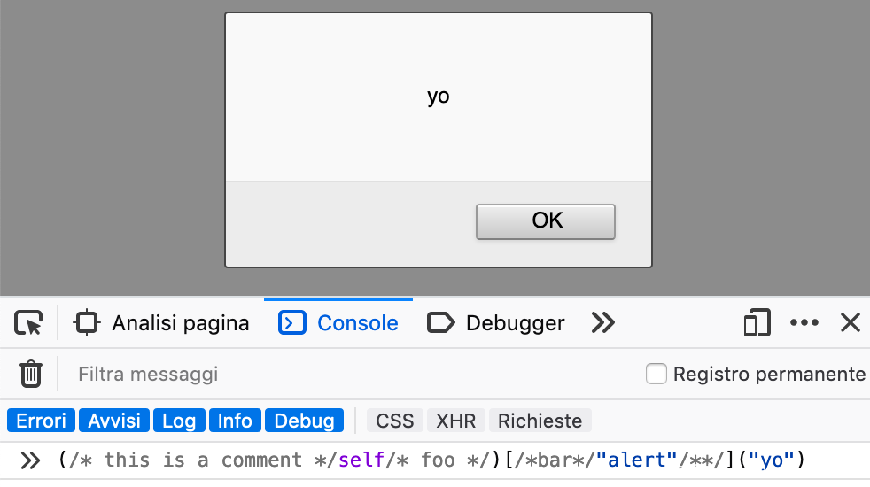 (/* this is a comment */self/* foo */)[/*bar*/"alert"/**/]("yo")