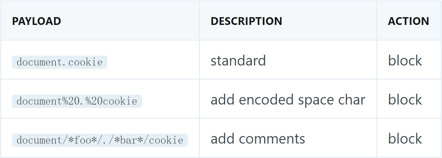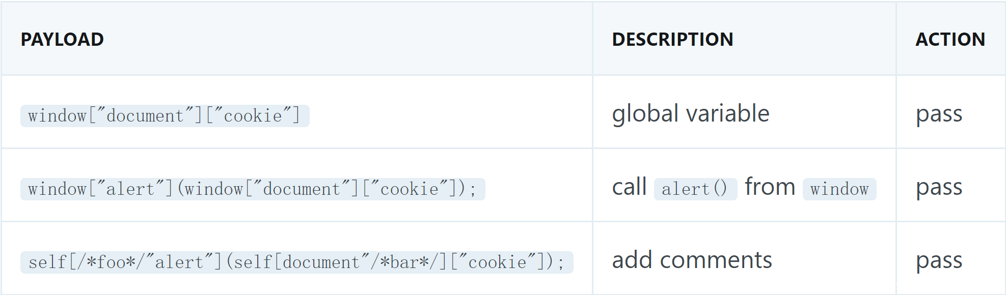 在这里,JavaScript全局变量可以用来绕过这个过滤器。我们有很多种方法来从window对象或self对象中访问到document.cookie,比如说,“window[“document”][“cookie”]”就不会被这个过滤器过滤掉: