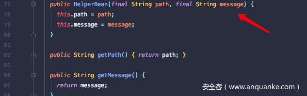 编写Codeql最重要的是先确定数据流的Sink点即污染点字段.这里跟进org.sonatype.nexus.validation.HelperBean#getMessage方法.返回message值.该值经由HelperBean方法传入