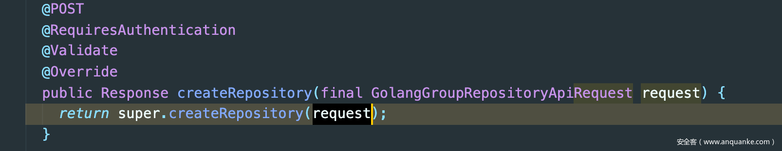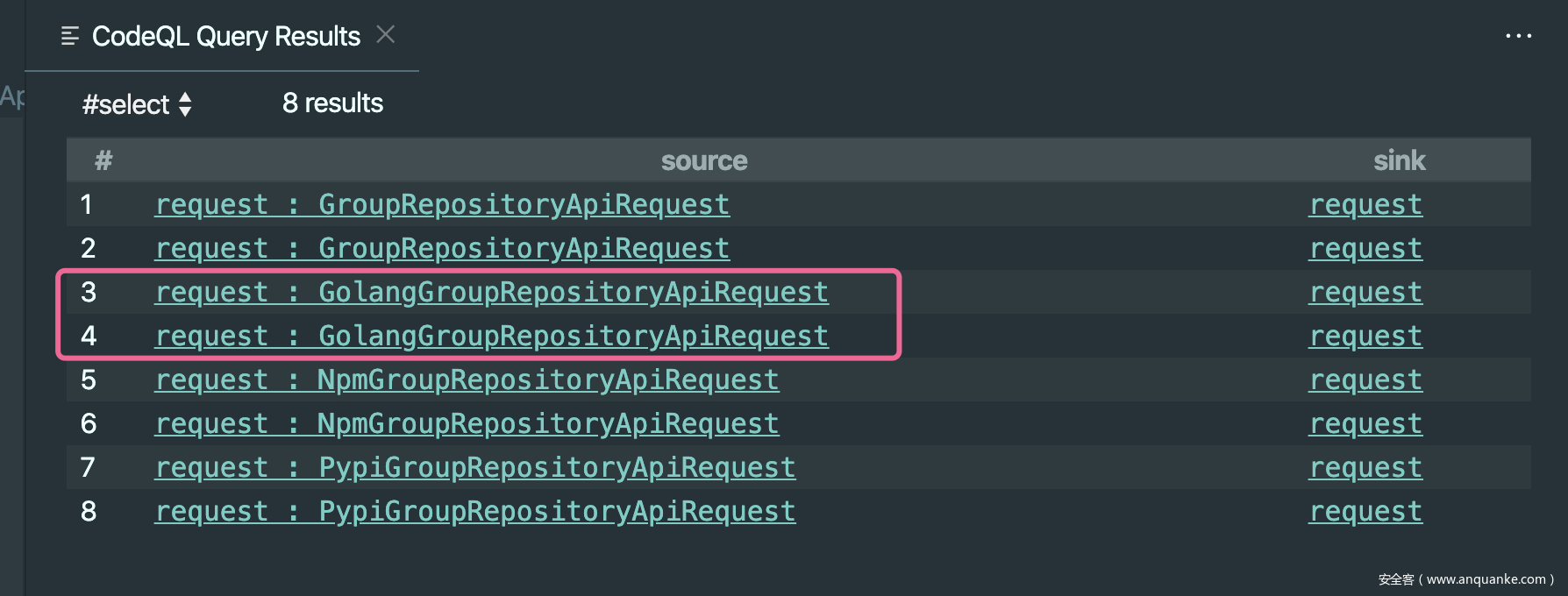 根据搜索结果,这里最可疑的souce就是AbstractGroupRepositoriesApiResource:92.点击该结果跟进,Codeql很友好对污染点respositoryName进行标记。向上溯源得到respositoryName值最终由request中获取.