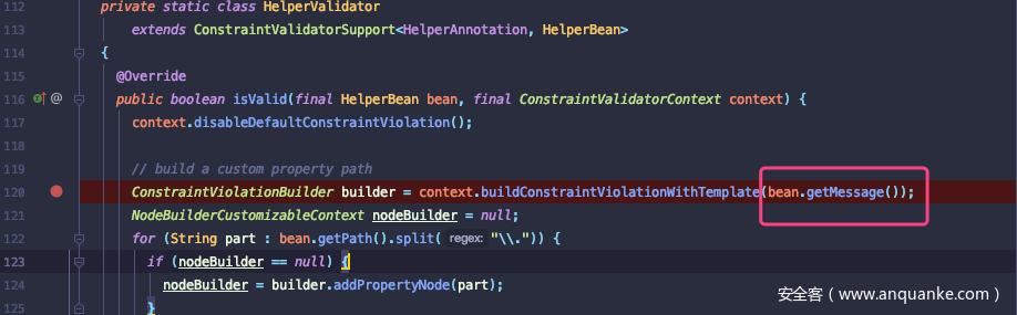 该漏洞是由于未做过滤造成表达式注入,作者确定漏洞点执行函数buildConstraintViolationWithTemplate,其该方法中bean.getMessage()返回结果message并未使用stripJavaEl方法过滤造成表达式注入