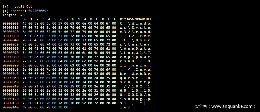 vbe7.dll是Visual Basic运行时引擎的DLL。里面有很多有趣的功能。但是在这里,我们想观察字符串去混淆操作,vbe7!__ vbaStrCat是在Visual Basic中串联字符串时调用的函数。
