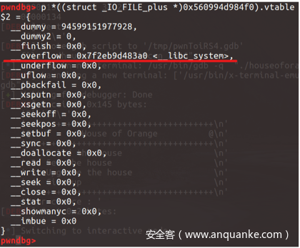 所以构造_mode=0,_IO_write_ptr=1,_IO_write_base=0,就可以绕过判断执行overflow