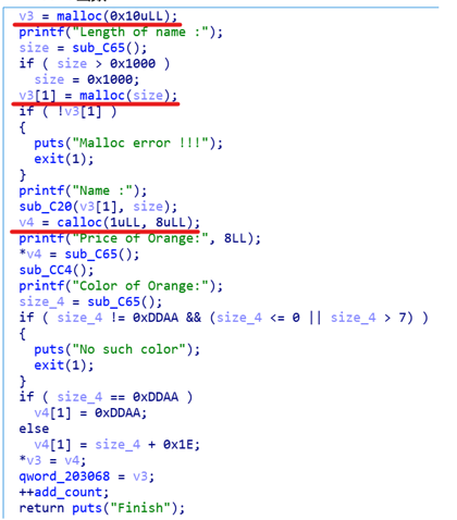 只能使用4次,每次build的时候会申请3次,两次malloc和一次calloc,固定0x20大小的chunk作为标记chunk,calloc的chunk用于记录颜色和价格,中间的malloc会申请我们输入的size的chunk,最大0x1000,用于记录name