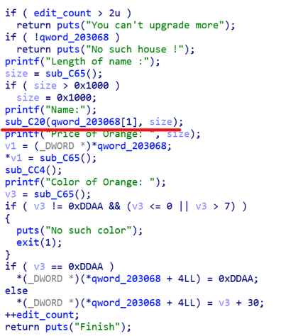 这个函数非常关键,漏洞都在这里,首先第一眼可以看到read这里存在堆溢出漏洞,因为我们申请的chunk大小固定0x68,可以修改下一个chunk的chunk head。