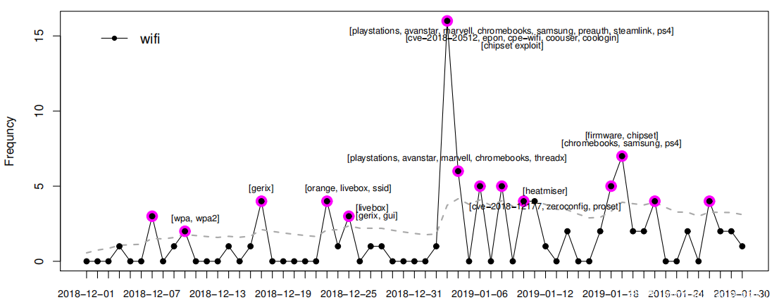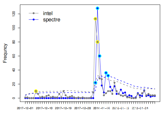 下图显示了重新出现单词的示例。在2018年1月3日公开披露Intel CPU漏洞时,同时检测到‘spectre’和’intel‘两个词。这两个词都表明提及人数迅速增加。特别是,“幽灵”一词在事件发生前一个月从未出现过。在“ wifi”一词的情况下,从“ wifi密码破解”,“ wifi破解程序”到“ wifi固件错误”等各种事件经常提到它。与“ spectre”和“ intel”不同,即使被触发为事件,提及的次数也大多低于10倍。