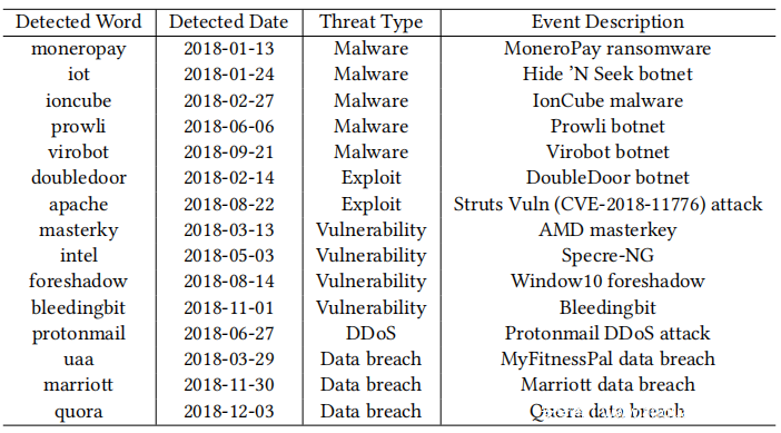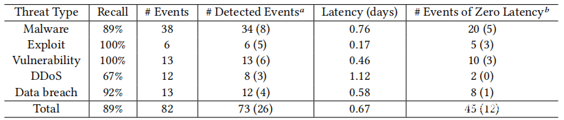 覆盖率和检测延迟:分析W2E涉及恶意软件,漏洞,漏洞利用,DDoS攻击和数据泄露等事件的范围。上表显示了82项安全事件中W2E的召回情况。 W2E的总体召回率为89%-在82个事件中检测到73个。在73个事件中,仅通过重新出现单词就检测到26个事件,因为它们的推文中未包含任何新术语。这验证了重新出现单词监视的重要性。