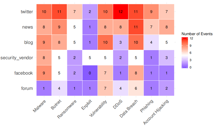 3.博客和安全厂商报告对于早期发现网络安全事件也很重要。博客和安全厂商共同讨论事件的数量超过了Twitter,在105个事件中,只有18%仅在博客和安全厂商报告中被提及。此外,他们与其他来源类型或更早的日期讨论了68%的事件。上图显示,博客和安全厂商报告是检测与恶意软件,漏洞和数据泄露有关的事件的良好来源。这表明通过利用Twitter,博客和安全厂商报告中的信息,可以期望更高的覆盖范围和更低的网络安全事件检测延迟。