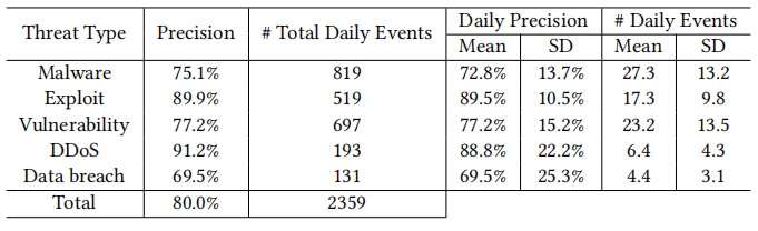 每日事件检测准确性:本研究测量每天产生多少误报,下表显示了W2E在选定月份中所有日常事件中的精度。 W2E的整体精度为80%,每种威胁类型的精度接近或大于70%。 W2E总共检测到2359个日常事件(平均每天79个),形成930个独立事件。在930个唯一事件中,有763个事件是真正的安全事件,因此W2E在当月唯一事件的准确性为82%。