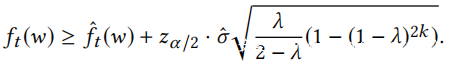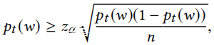其中pt(w)= ft(w)/n,其中在时间t包含单词w的推文的ft(w)数和zα是标准正态分布的(1∞α)-百分位数。请注意,对于95%置信度(α= 0.05),z0.05 = 1.645。如果要从候选新单词中删除更多单词,他/她可以提高置信度。