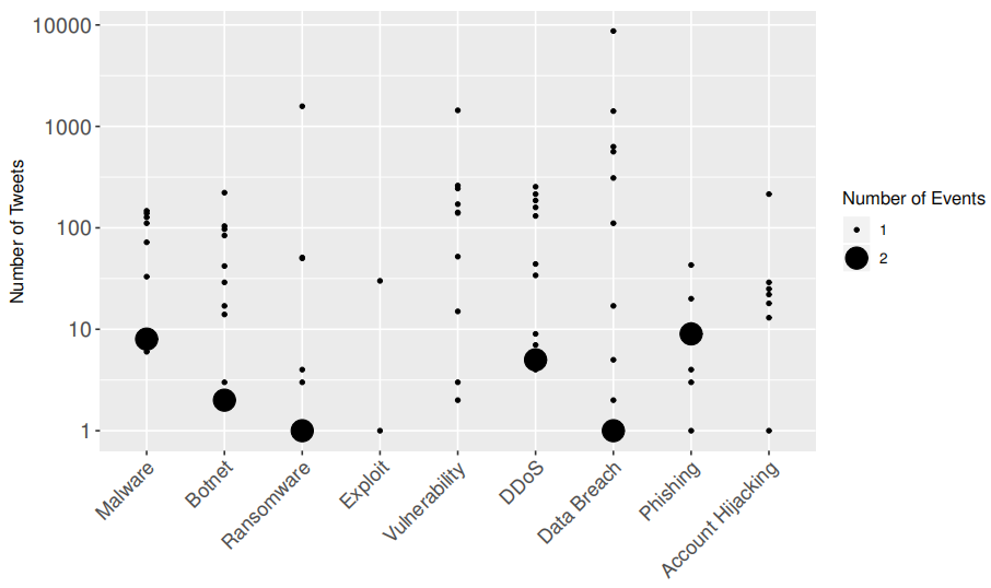 4.提及的次数与早期网络安全事件的重要性不成比例。上图显示了每种威胁类型在事件发生第一天发布的推文数量。尽管选择热门事件,但第一天许多事件很少提及。实际上,第一天在Twitter上提到的事件中有23%被提及的次数少于5次,而在事件中有37%的事件被提及的次数少于10次。这表明,不管安全事件的重要性如何,都需要花费一些时间来吸引许多人的注意。