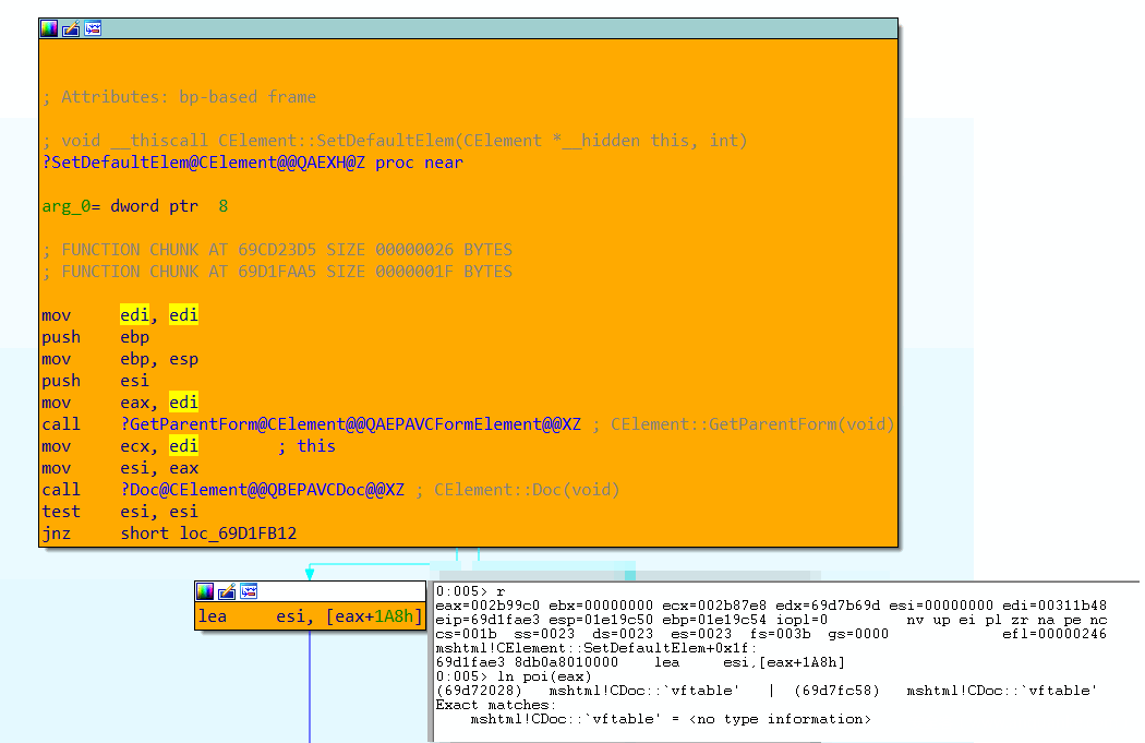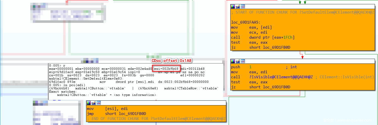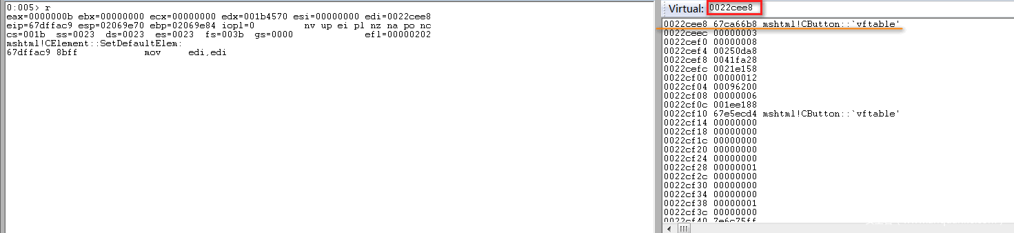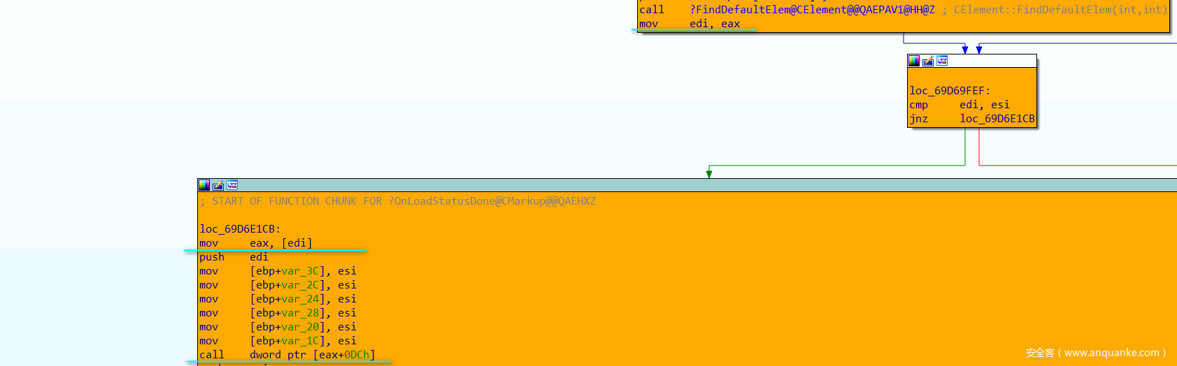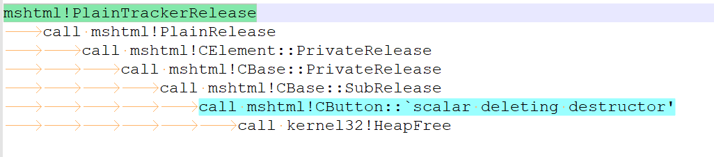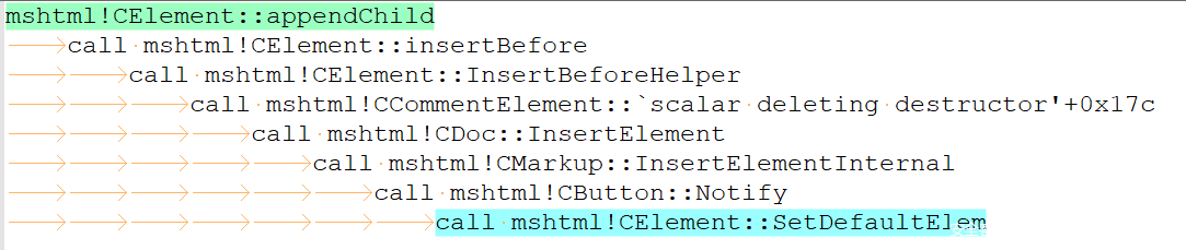 mshtml.dll在释放CButton对象后没有更新CDoc中Default Element对此地址引用,以致后续CElement::FindDefaultElem会重新获取此地址,传递给CMarkup::OnLoadStatusDone函数,使用已释放内存。
