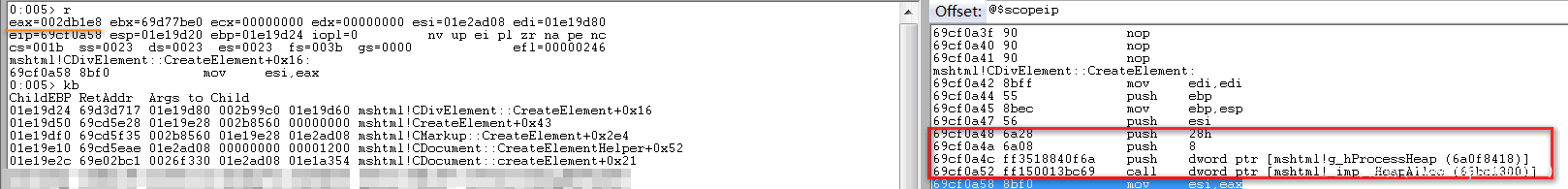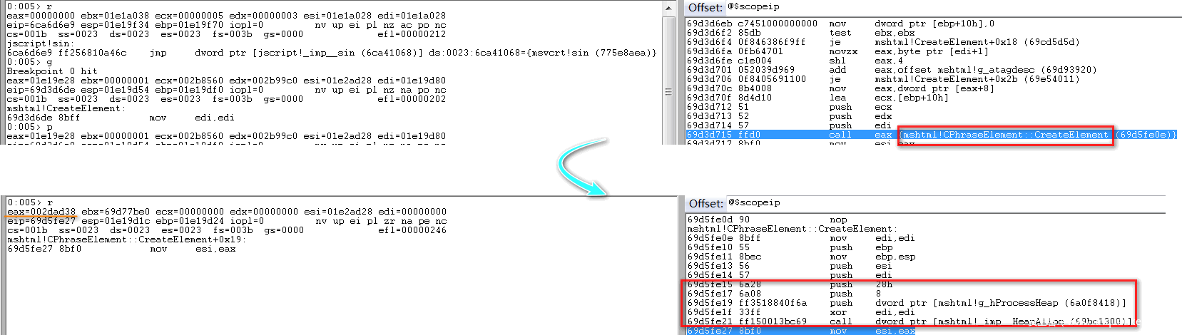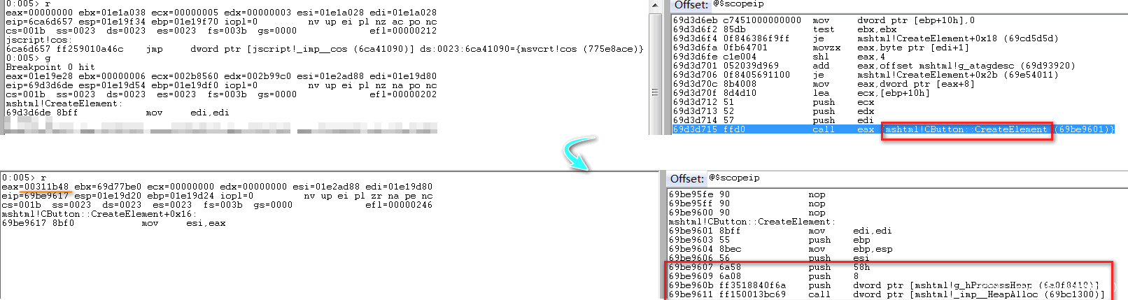 借助Math.tan、Math.sin、Math.cos(分别对应jscript!Tan、jscript!sin、jscript!cos)及mshtml!CreateElement可观察各对象的创建。document.createElement("div"):