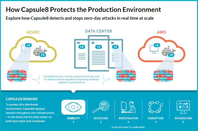 Capsule8认为在桌面环境中的0day防护已经取得了很大的进步,但在生产环境中0day防御能力是不足的。生产环境中需要处理大量的工作负载、存储关键信息和客户敏感数据,因此安全尤为重要。他们宣称能够提供一个实时的0 Day攻击检测平台,可以在攻击发生的时立即中断连接,能够应用于大规模生产环境中,无论是容器、虚拟化还是物理机都能够提供持续的安全保护。