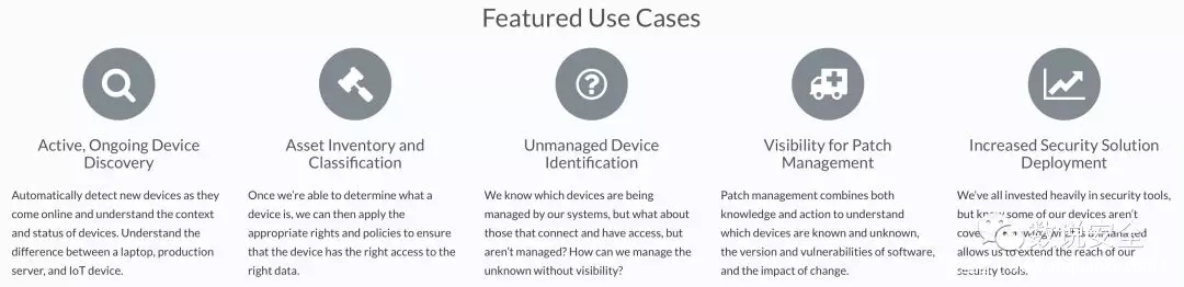 他们的解决方案先从资产可视化入手,将企业所有的设备统一纳入管理范围并提供一张所有设备的视图(包括IoT设备和BYOD设备)。可通过使用适配器通过API与现有系统连接,以发现、分析和关联设备信息,为每个设备创建唯一标识和配置文件。最后可通过插件实现跨设备的动作执行。官方提供了5个Use Cases:不间断的活动设备发现、资产清查与分类、未管理设备识别、补丁管理、安全解决方案增强。