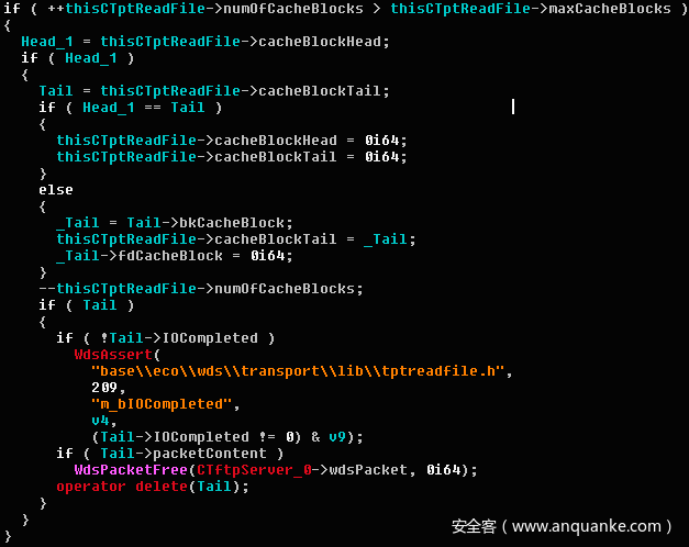 了解TFTP协议的这个特征后,再配合blksize和windowsize选项的使用,我们应该可以构造一个请求,在收到确认(acknowledgement)数据包前生成两个以上cache blocks。如果一切顺利并且把握好时机,某个cacheblock在被CTptReadFile::_IOCompletionCallback回调函数使用前就会被释放掉。