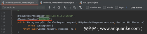 对unzip方法进行跟进,发现它的具体实现在WebFileControllerAbstractor.java中。可以发现,在对zip文件进行解压的时候,调用了AntZipUtil类的unzip方法,如图所示。