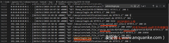 那么这一war包是如何被上传到服务器的呢?继续对日志文件进行分析,在分析的时候重点关注“可能为文件上传功能的接口”。可以初步判断,黑客曾在使用该Webshell之前使用ZIP上传和ZIP解压功能,如图所示。