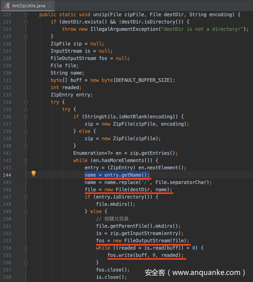 对AntZipUtil类的unzip方法进行跟进,可发现该方法未对ZIP压缩包里的文件名进行参数校验,就进行文件的写入。这样的代码写法会引发目录穿越漏洞,如图所示。