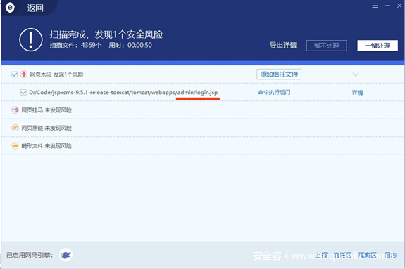 为了判断攻击者是否上传网站木马,使用网站安全狗的Webshell AI 检测引擎对Tomcat的webapps目录进行扫描,可发现名为“/admin/login.jsp”的文件被识别为Webshell(黑客对这一Webshell的命名具有一定的迷惑性),如图所示。