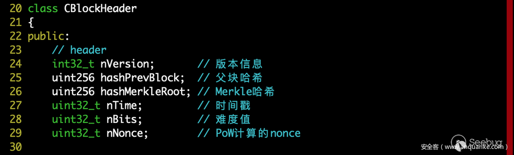 在比特币中,区块由区块头和 Merkle 交易树组成,区块头数据结构定义在 primitives/block.h,如下: