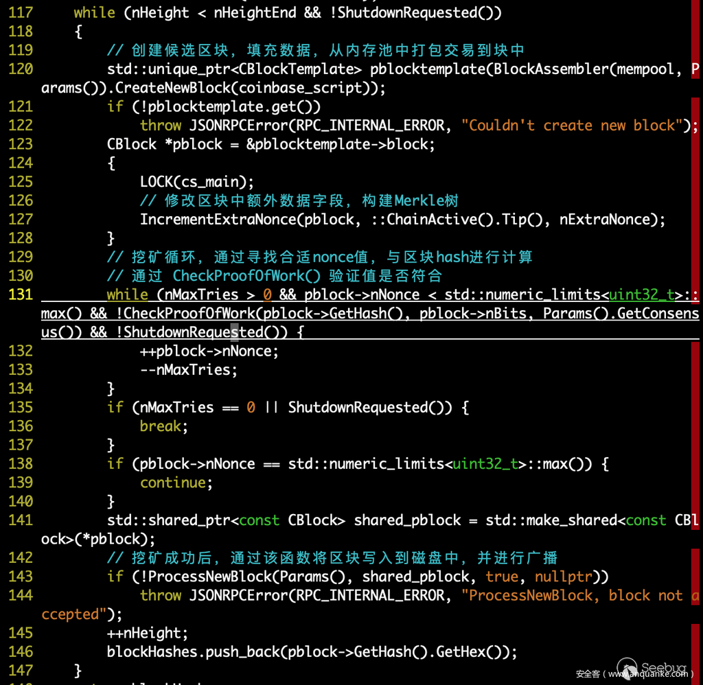 其中包括 RPC 服务,在比特币中我们需要使用 bitcoin-cli 通过 RPC 服务启动挖坑,最终到 rpc/mining.cpp/generateBlocks() 这个区块生成主逻辑: