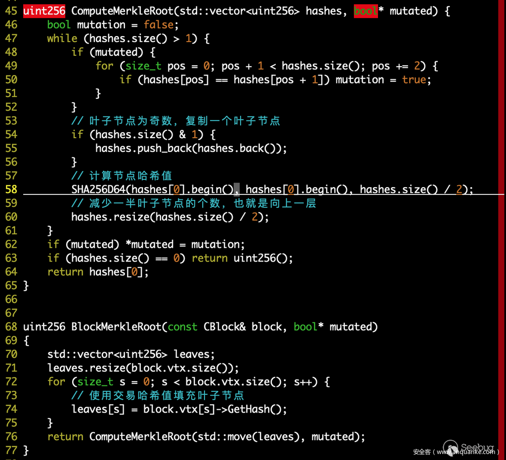 - Merkle 树实现 在比特币中,Merkle 树的生成是挖矿步骤中的子步骤,跟入上文中的区块生成流程中的 miner.cpp/IncrementExtraNonce() 函数中,在该函数中调用 consensus/merkle.cpp/BlockMerkleRoot() 函数以构建 Merkle 树: