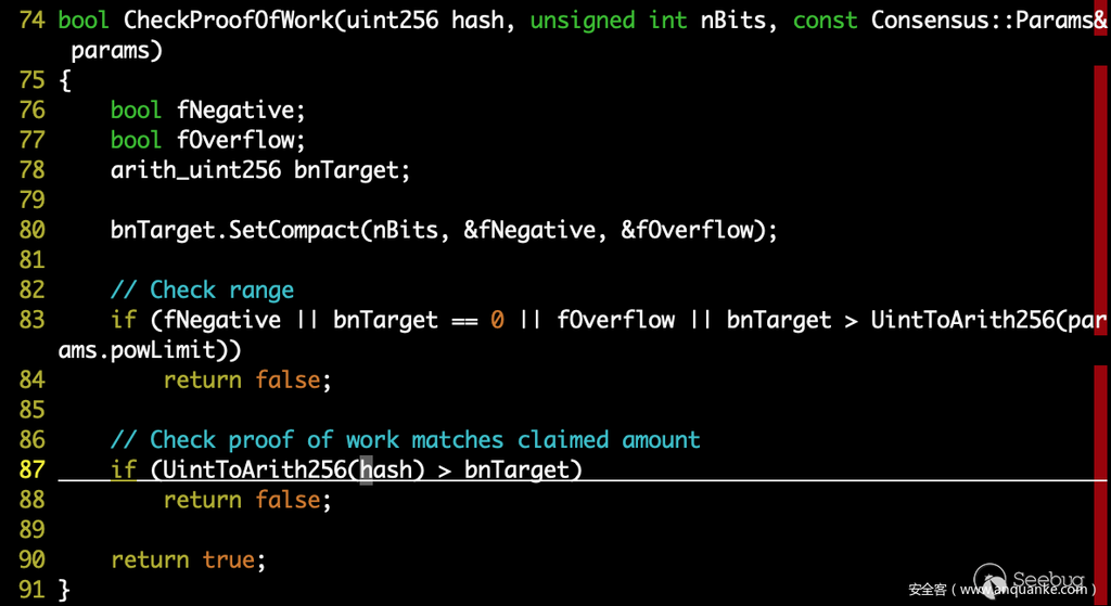 其中 pow.cpp/CheckProofOfWork() 函数进行了 PoW 算法的验证,主要是判断在当前 nonce 值的情况下,区块哈希值是否小于难度值: