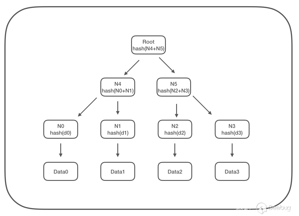 在比特币中,使用 Merkle 树组织和存储一个块内的交易信息,它是一种基于哈希的二叉树(或多叉树),其结构如下: