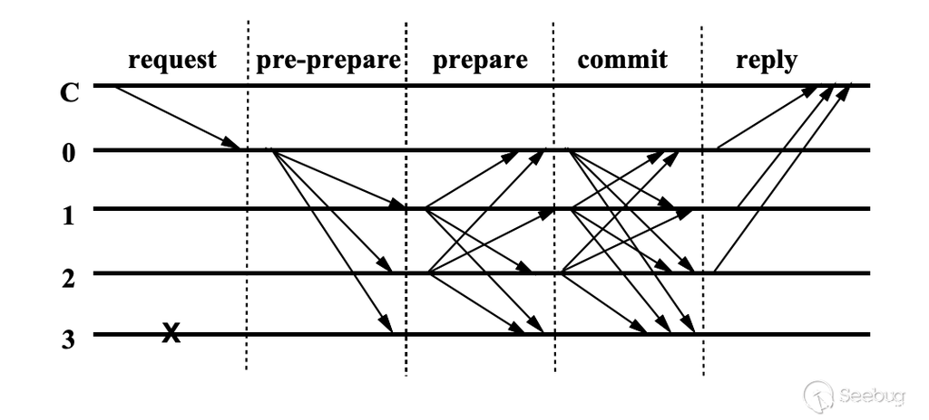 其中 C 表示发起请求客户端,0123 表示服务节点,3 节点出现了故障,用 f 表示故障节点的个数。