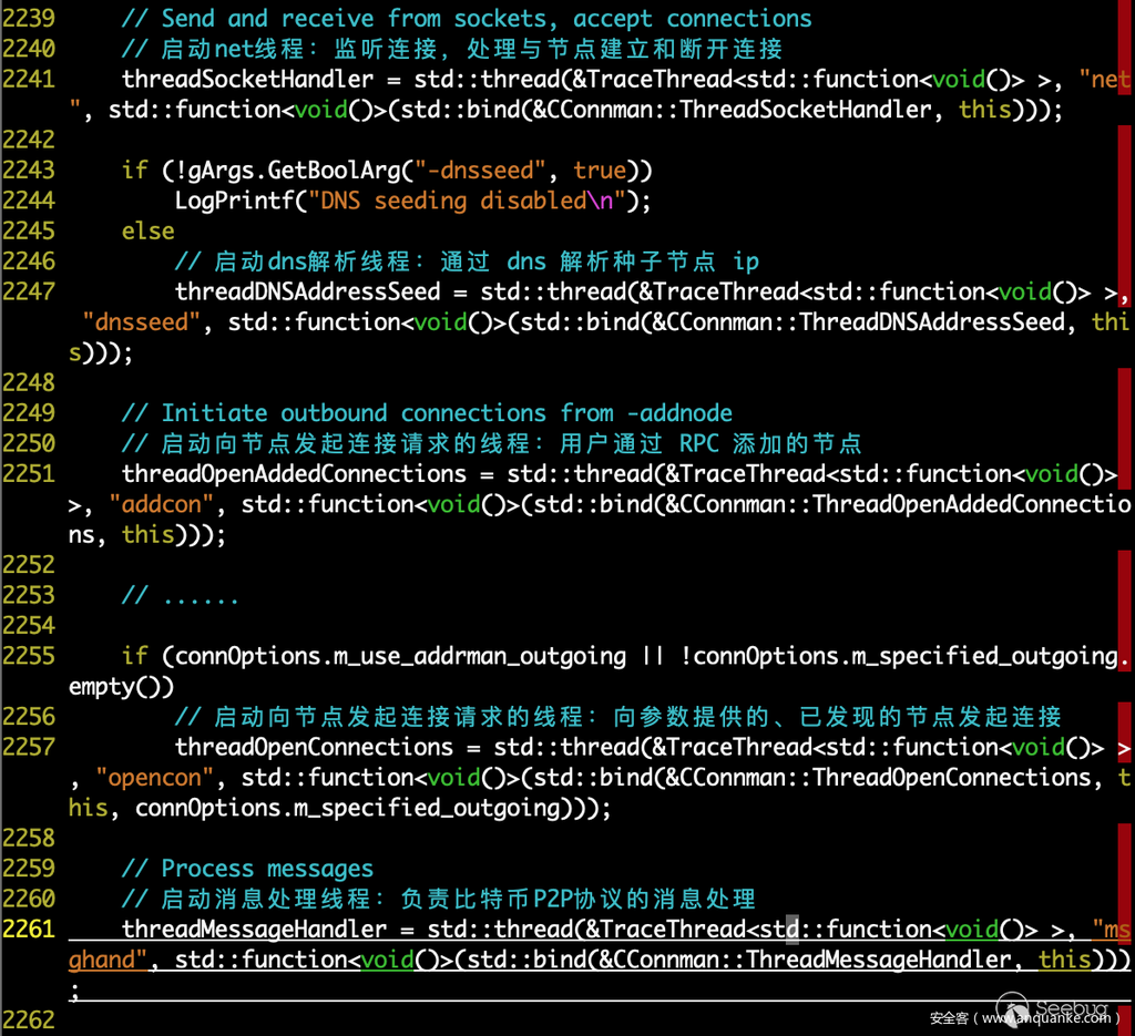 在比特币中,默认在 8333 端口建立 tcp 监听,启动 p2p 服务。在 bitcoind 启动流程的 init.cpp/AppInitMain() 中,对网络进行了初始化启动:
