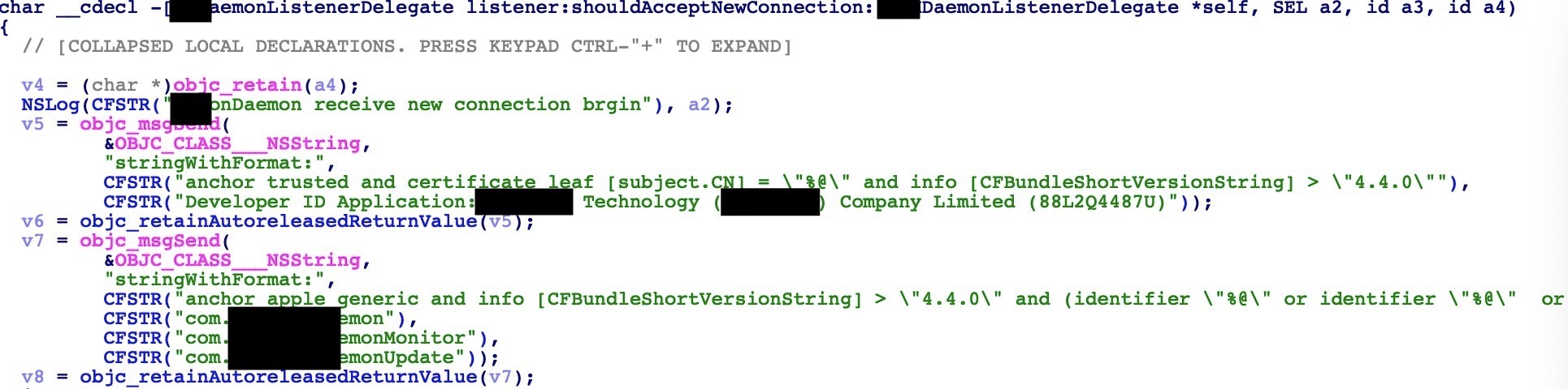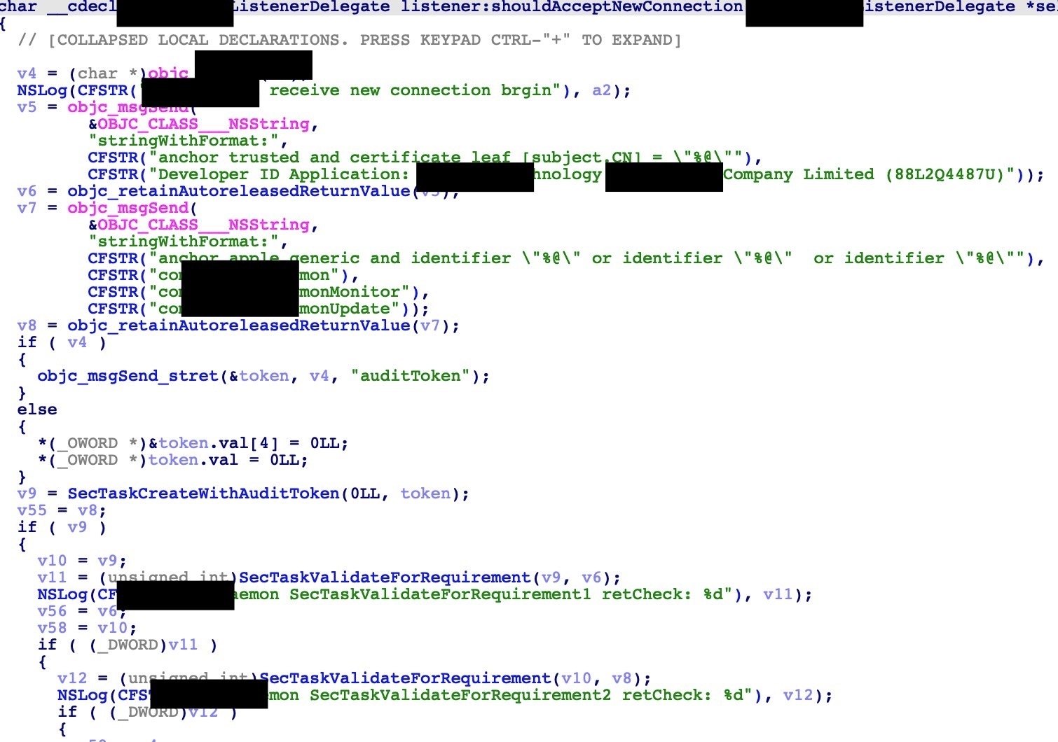 首先这个软件是一个垃圾清理软件,注意到后台有一个root权限运行的daemon进程,那么我们直接IDA反编译,找到shouldAcceptNewConnection函数。