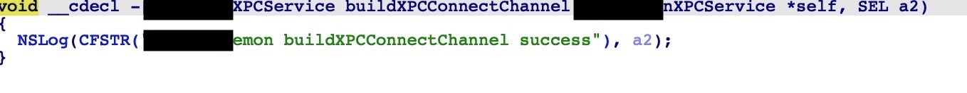 我们先来试试能不能调用导出的buildXPCConnectChannel函数,因为这个函数没有参数,比较简单。在IDA中可以看到该函数会打印一个log: