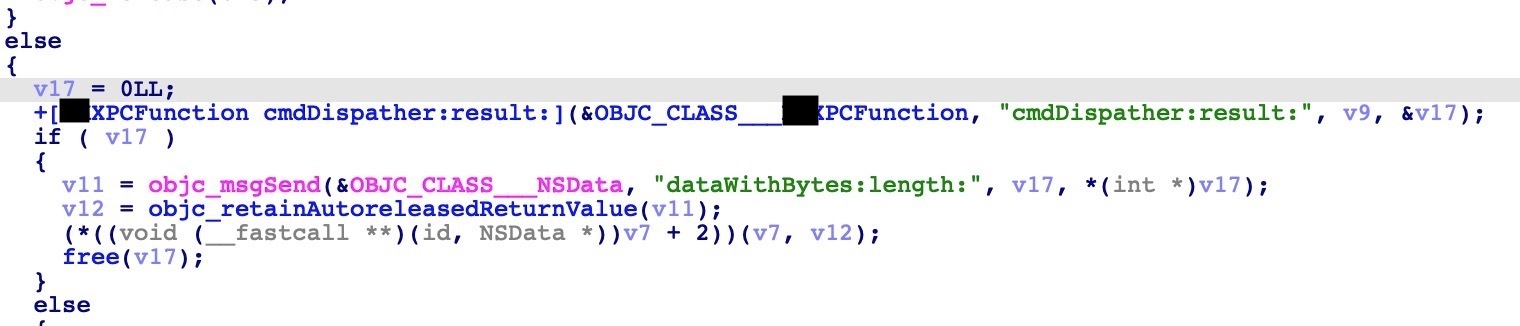 接下来我们想要证明这个漏洞是有实际危害的,通过前面class-dump的结果可以知道还有一个sendDataToDaemon的导出函数,在IDA中看到这个函数调用了cmdDispather函数: